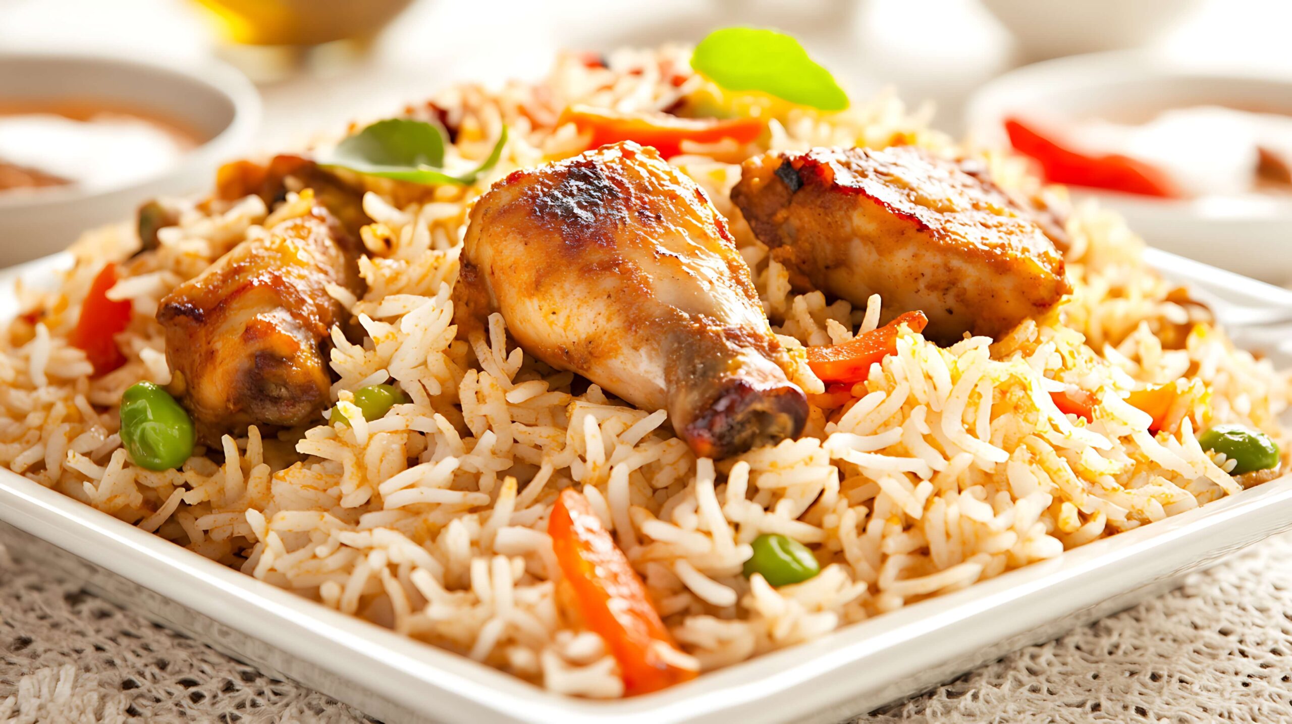 Agneau, poulet, bœuf, légumes avec riz basmati.